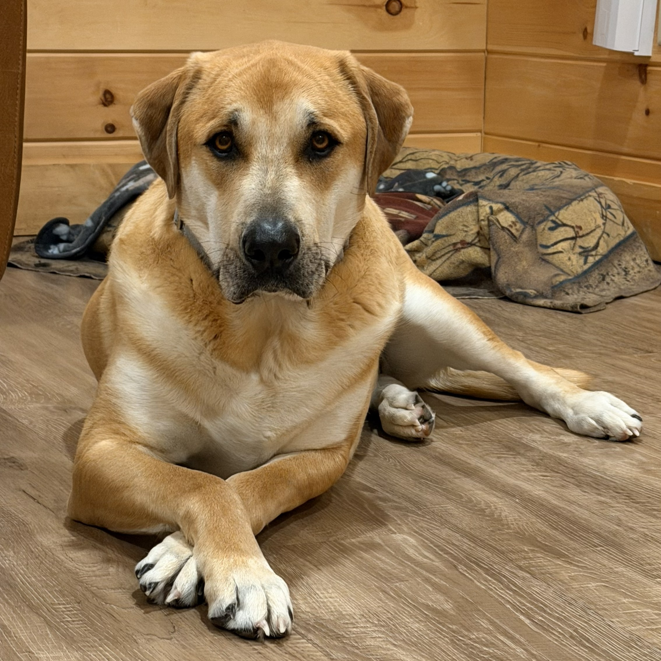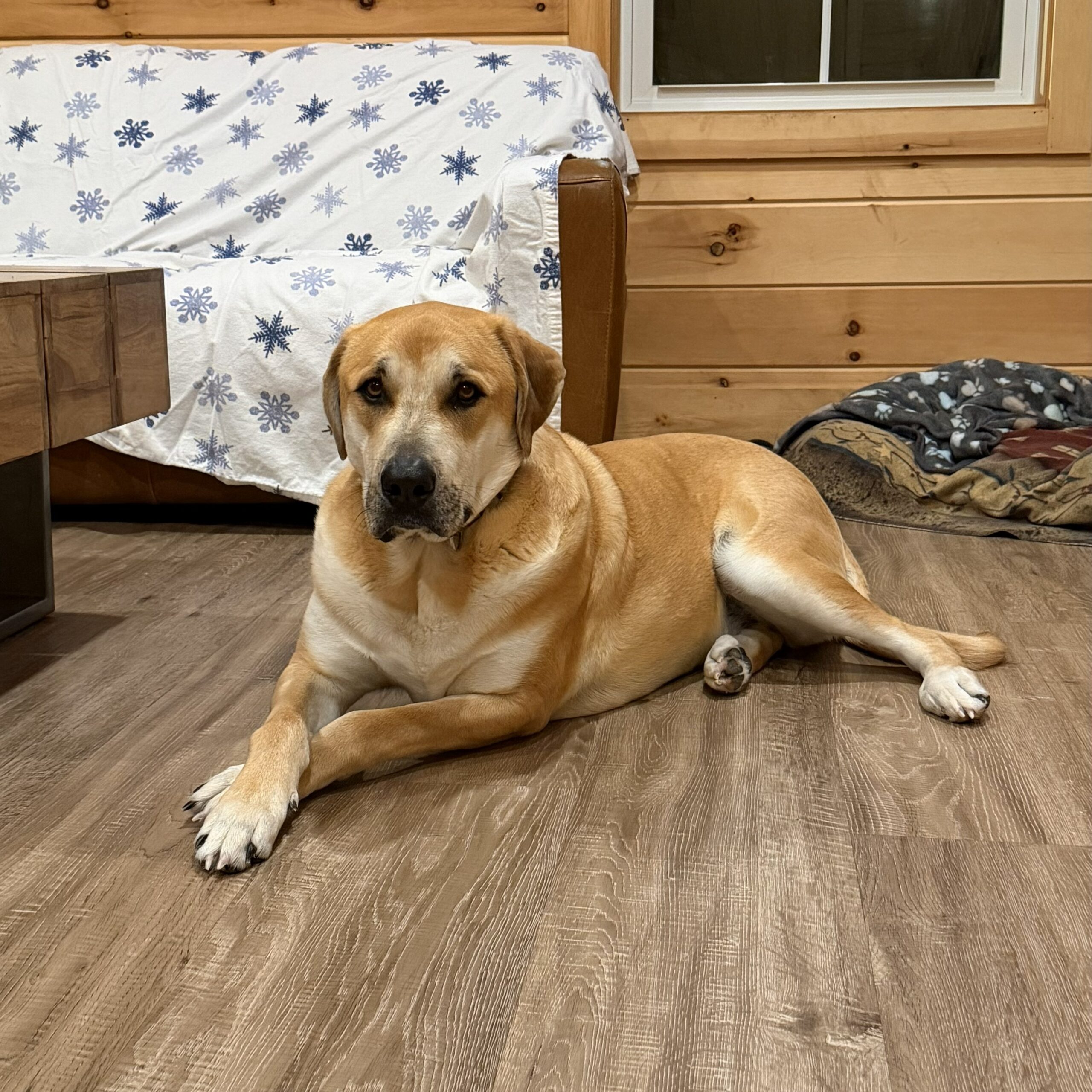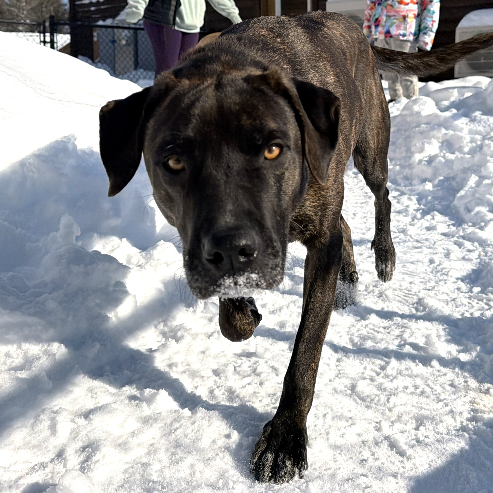 Maverick is a gentle giant. Don’t let his size fool you! He is a sweet and gentle and would make a great family dog. He likes to go out on walks and gets along with other dogs. He has been enjoying running around in the snowy backyard of the cabin.