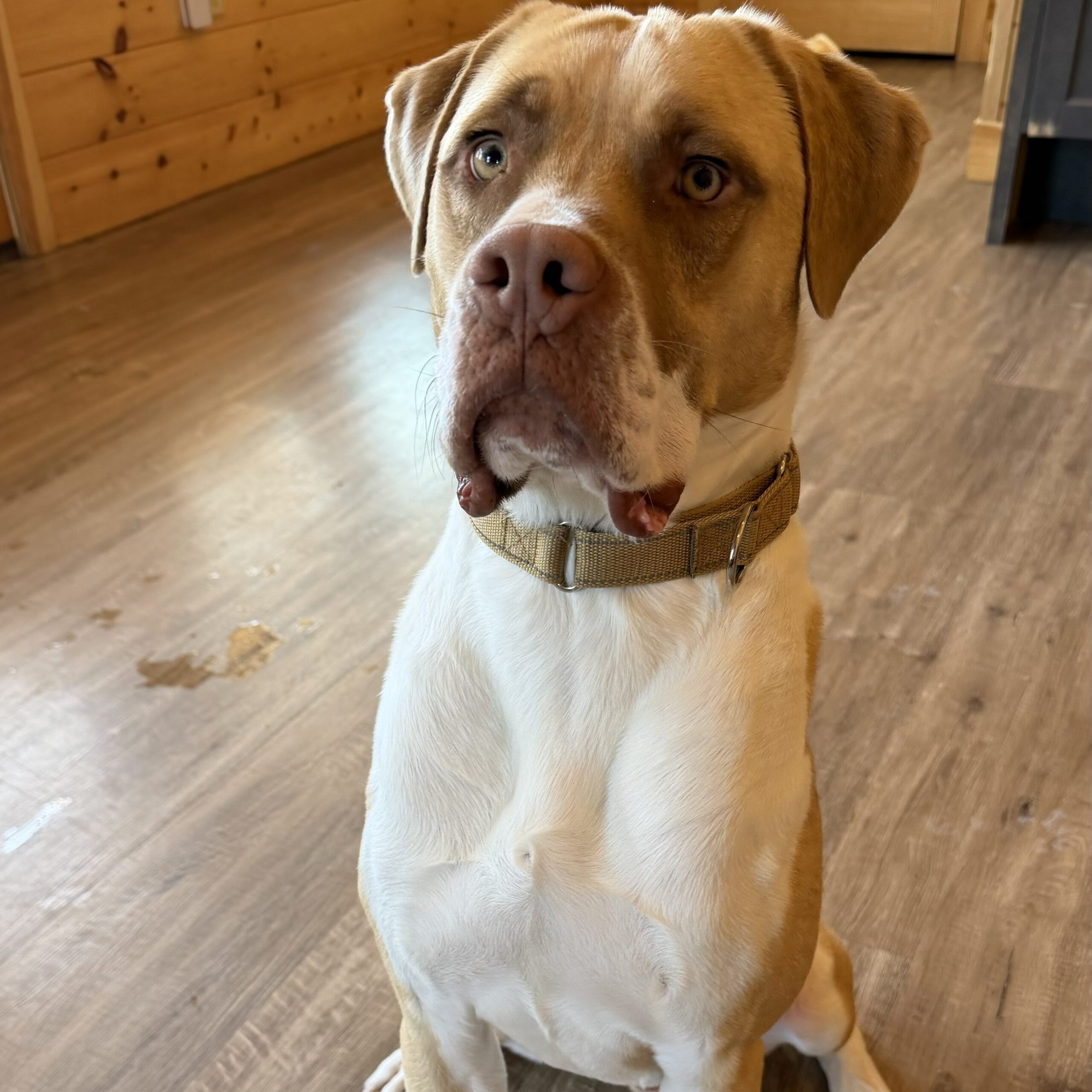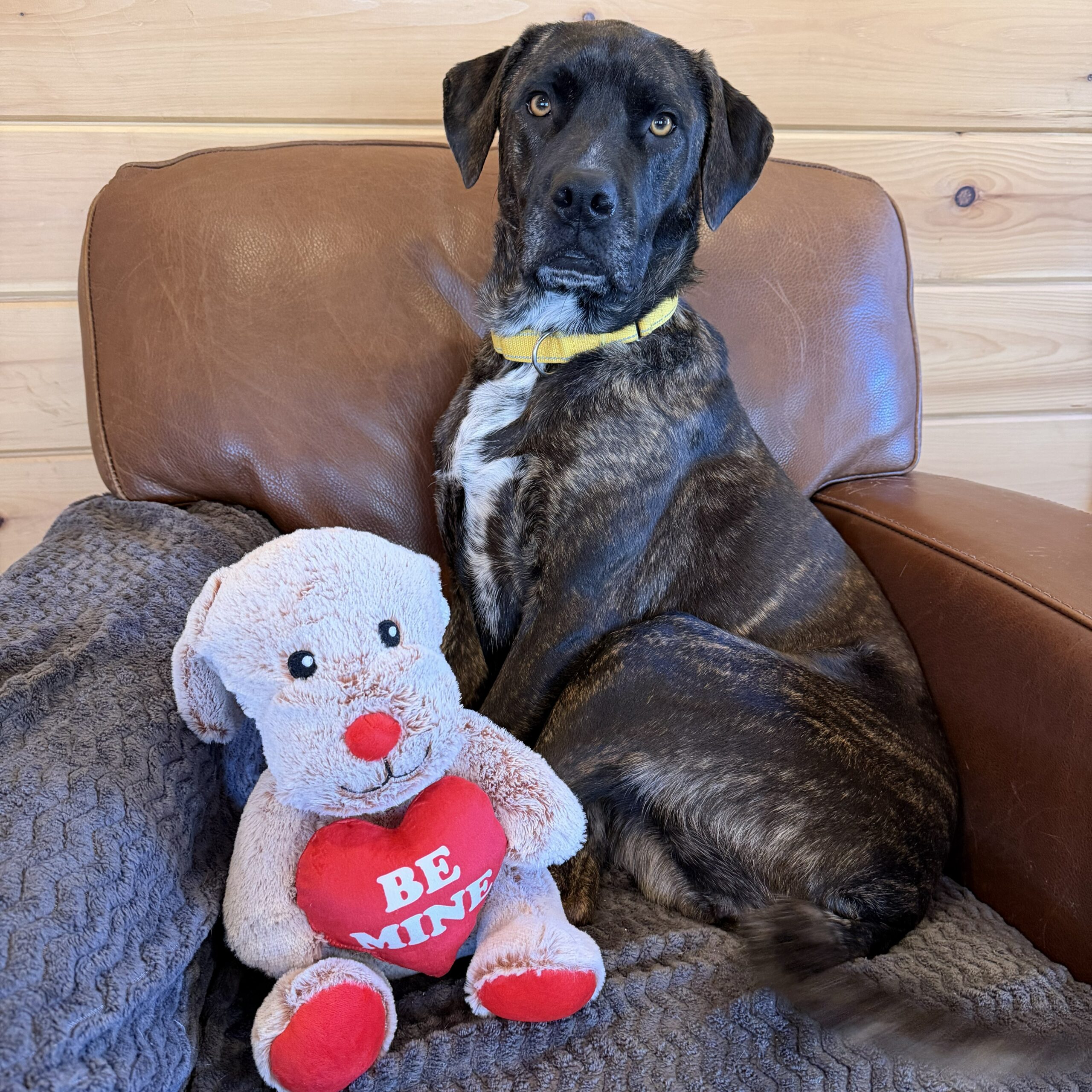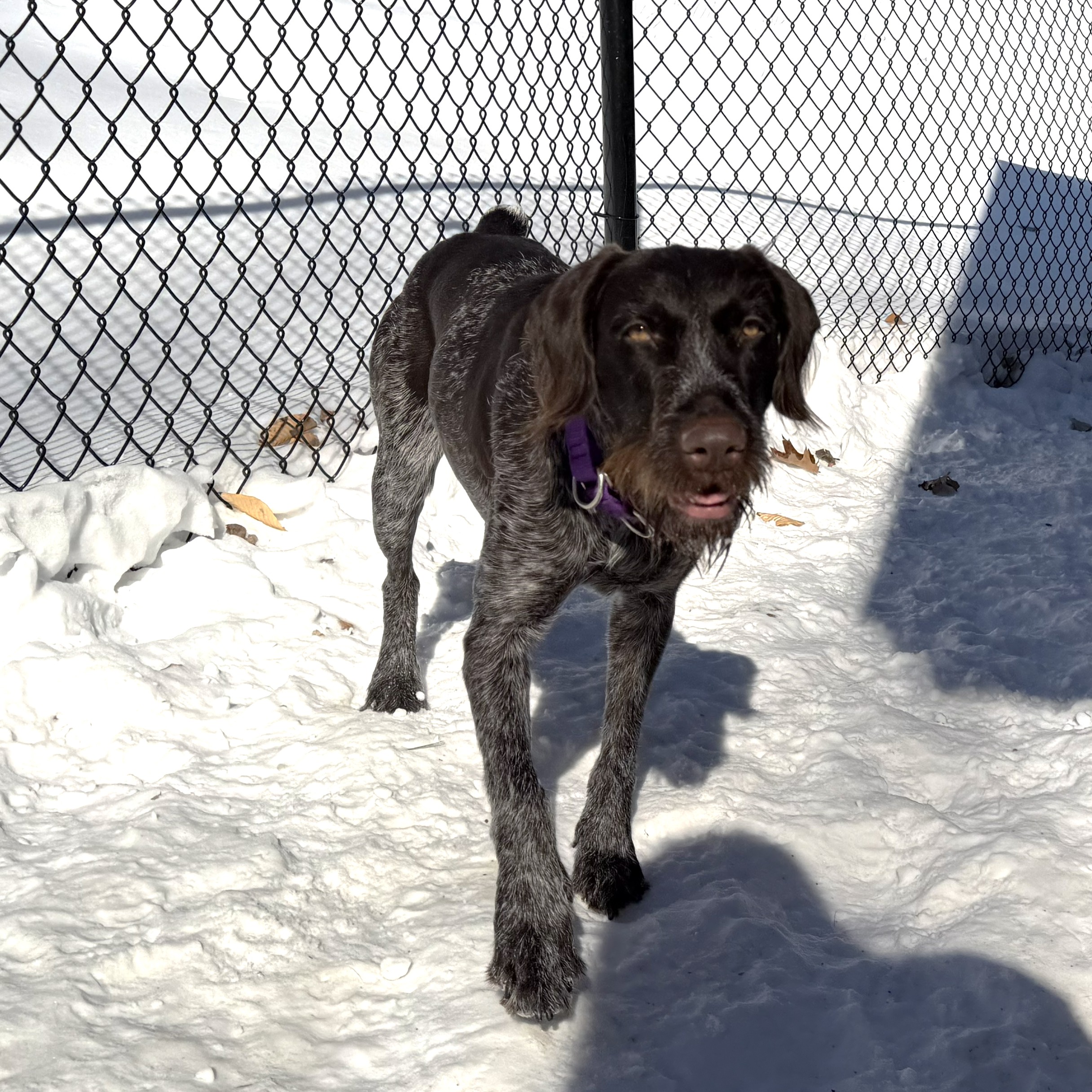 Myles is a sweet boy who is very interested in what you are doing at all times. He loves toys and running in the snow doing zoomies. He plays very gently even when mouthy but has zero awareness of his limbs and is a bit clumsy. He knows sit, laydown, out/drop it, and we have been working on off, paw and sit-stay. He walks well on leash and gets excited when you take the leash out. He is good with people and kids, but he is a bit dog selective so a home without another dog would be best.