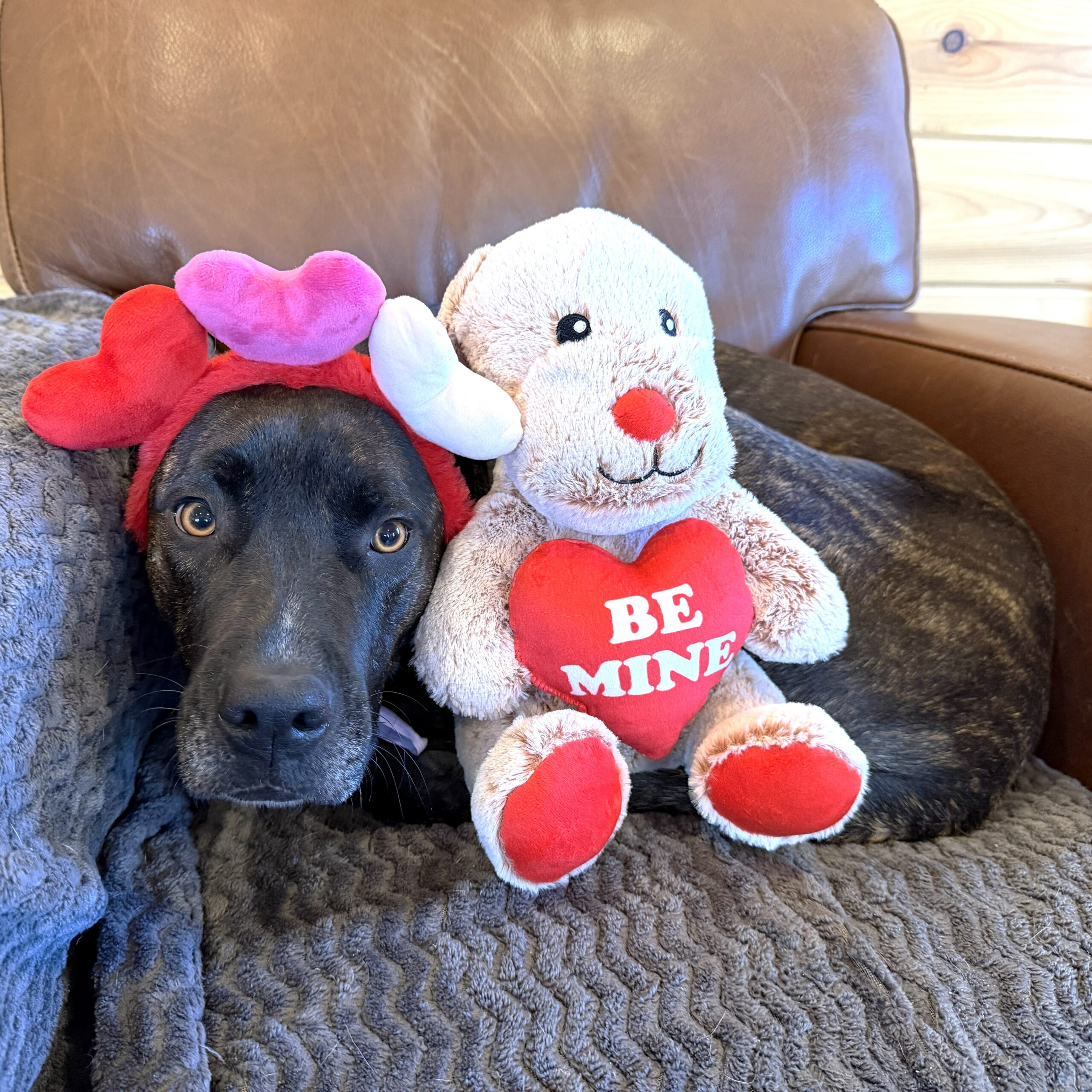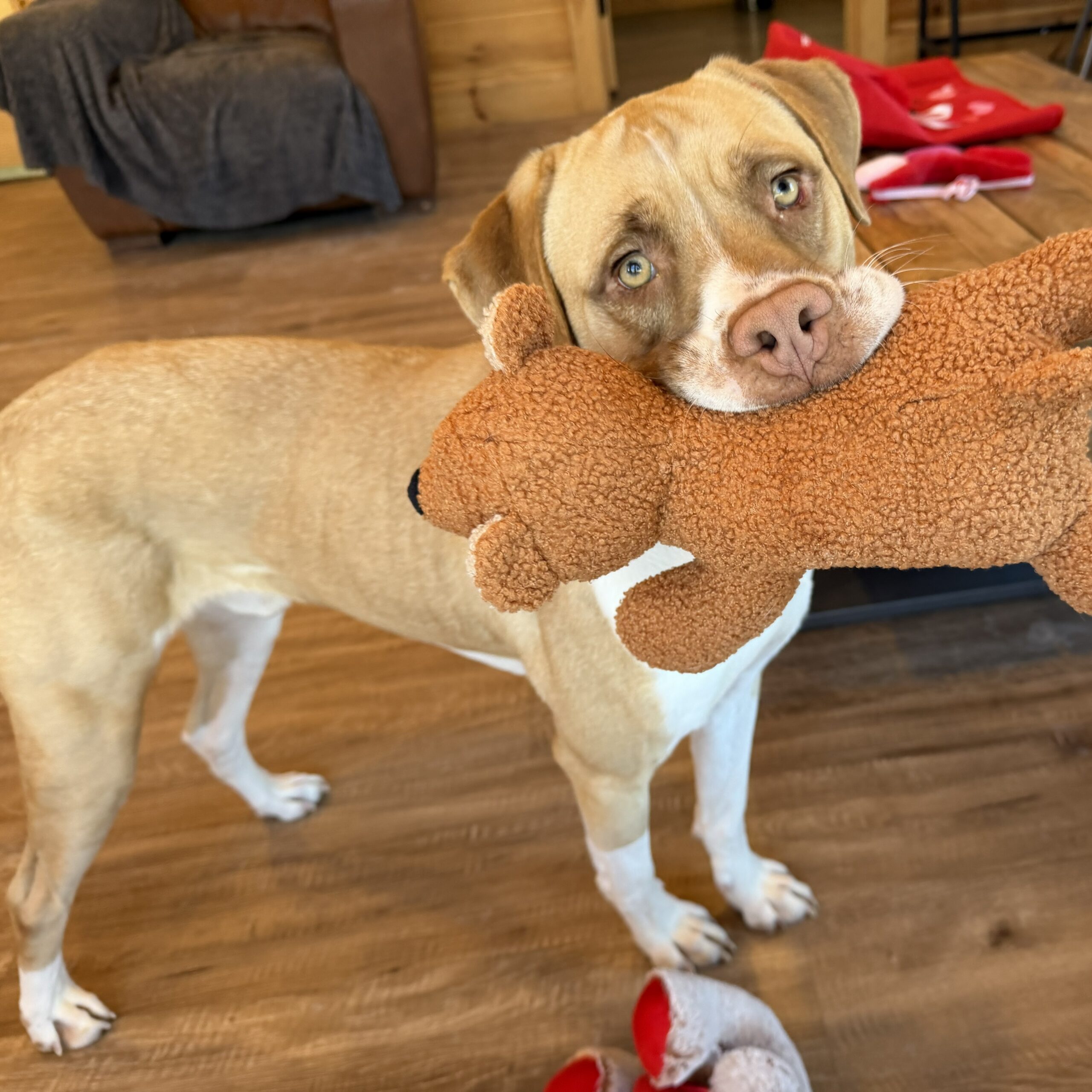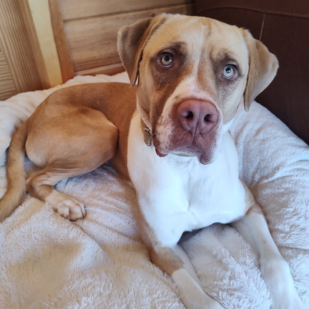 Myles is a sweet boy who is very interested in what you are doing at all times. He loves toys and running in the snow doing zoomies. He plays very gently even when mouthy but has zero awareness of his limbs and is a bit clumsy. He knows sit, laydown, out/drop it, and we have been working on off, paw and sit-stay. He walks well on leash and gets excited when you take the leash out. He is good with people and kids, but he is a bit dog selective so a home without another dog would be best.