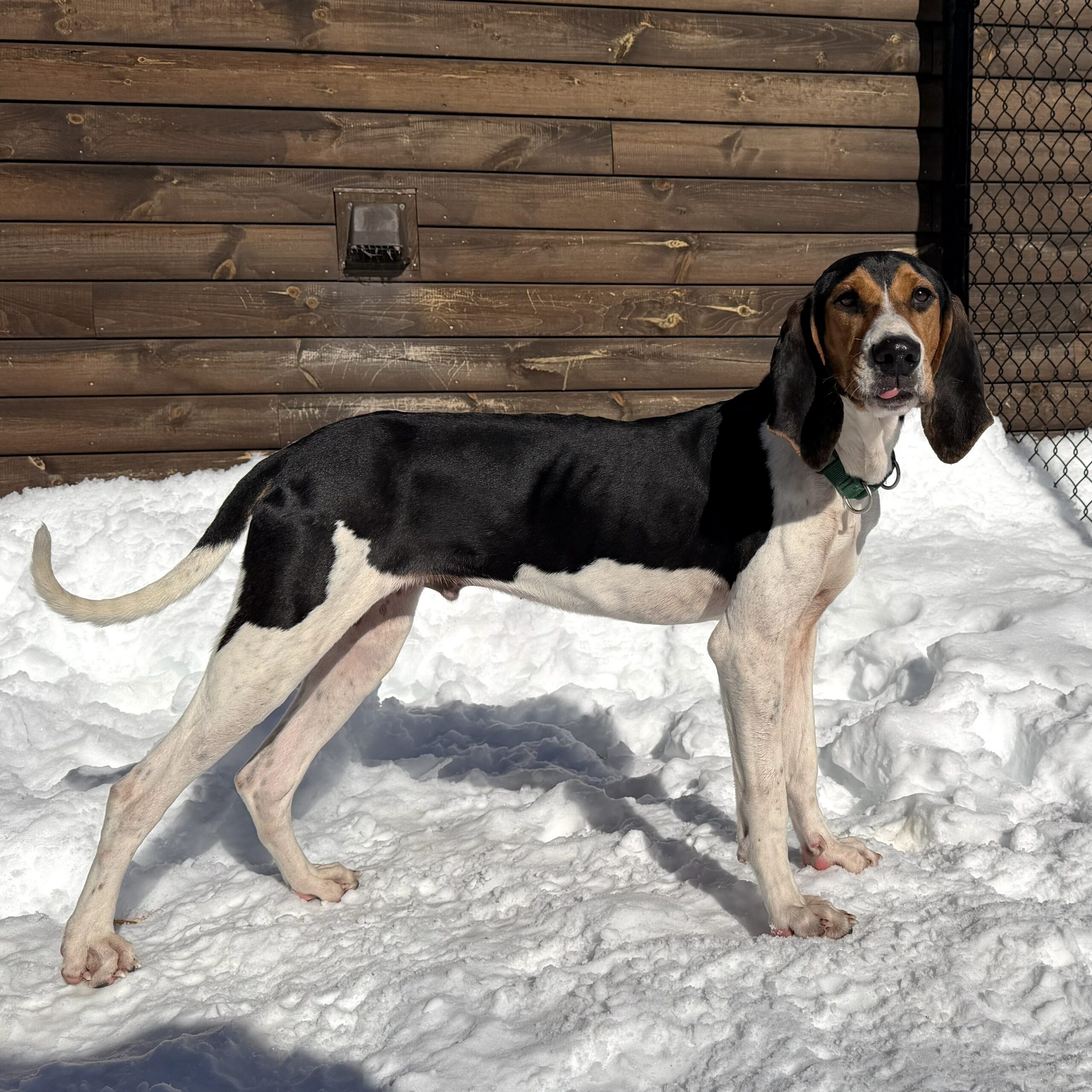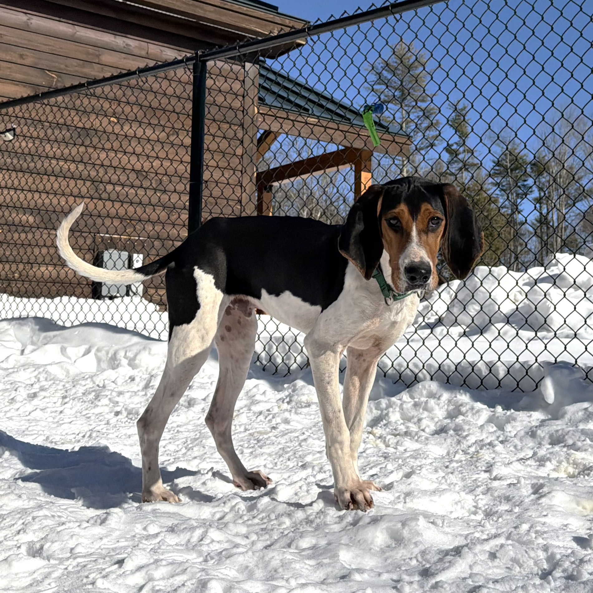 Logan is a coon hound mix. He is a fun boy! He is so sweet, likes couch cuddles and scratches. He needs some work on a leash, but he loves going on the hike trails so much. He does well with other dogs and really enjoys having a friend. He loves snacks, puzzle toys and snoop balls!